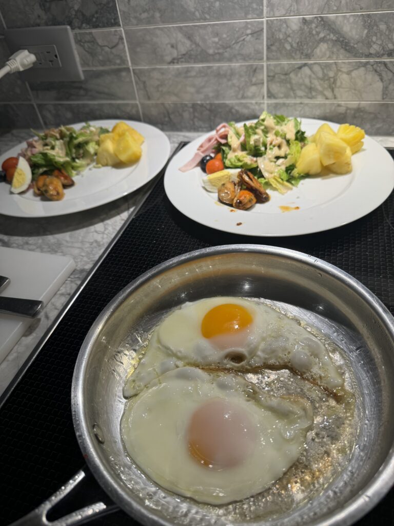 出来立ての目玉焼きとフルーツを並べて、ラナイ(バルコニー)へ。
